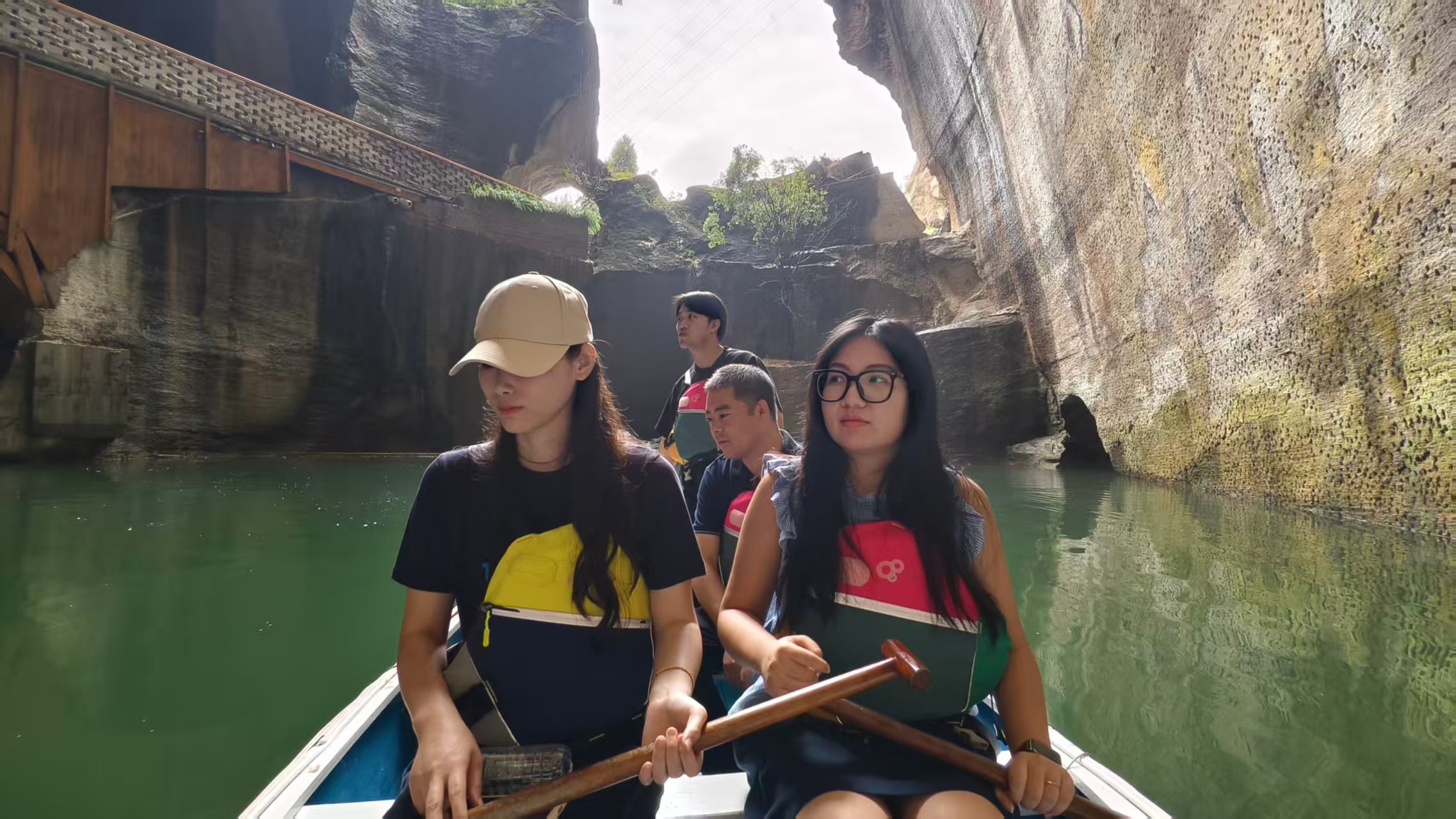 Unik "berperahu di pegunungan kosong": perairan di area pemandangan itu vertikal dan horizontal, dan Anda dapat berpindah antar gua dengan perahu. Permukaan air yang hijau sangat kontras dengan dinding batu yang kasar, seolah memasuki alam rahasia yang terisolasi, dan pengambilan gambar sangat tidak biasa.